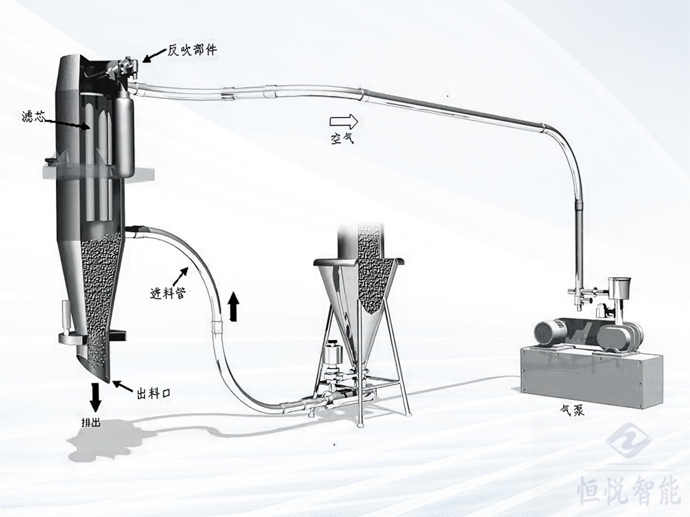 由射頻發生器產生真空即負壓即真空狀態,通過吸料管從儲料桶中將物料吸入料倉內,物料隨同空氣吸入上料口形成混合氣流,在料倉內進行空氣與物料分離,分離出來的物料通過下料口進入好色先生视频下载料倉,反衝裝置將吸附在過濾器上的物料清除再次進入真空吸料機料倉。